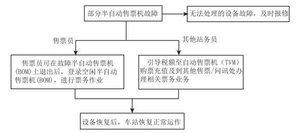 当全部半自动售票机发生故障时,会影响车站内售票充值的能力以及乘客票务处理的能力。此时,票务员应及时通知值班站长,值班站长应通知中心站站长现场情况,由中心站站长逐级向公司汇报,由中心站站长根据客流情况下令发售预制票来缓解车站的售票压力,票务员应按地铁票价表发售预制票;同时开启车站所有可用自动售票设备。