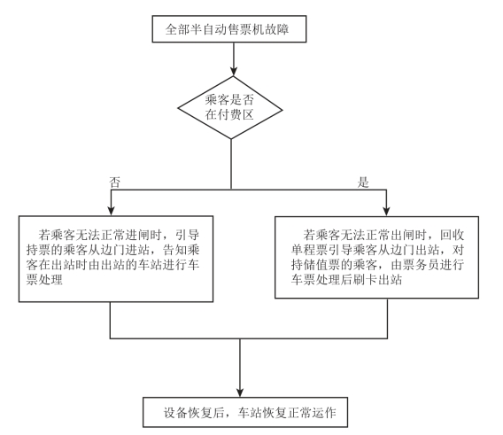 当全部半自动售票机发生故障,乘客在付费区时,对持单程票的乘客,由票务员回收其单程票并引导其从边门出站;对持储值票的乘客,由票务员进行车票处理后刷卡出站。
