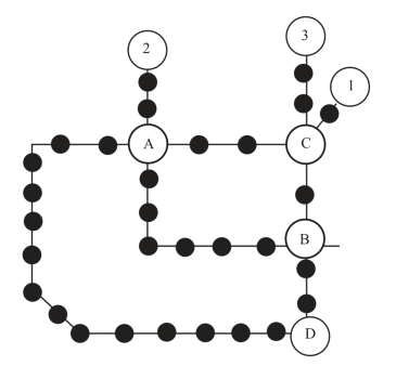 从A站到B站有三条路径可以选择,分别为ACB,AB,ADB,如图10-2所示。AC所花费的时间为10 min,CB所花费的时间为5 min,AB所花费的时间为15 min,AD所花费的时间为30min,DB所花费的时间为5 min,每次换乘需要5 min。