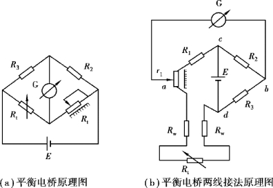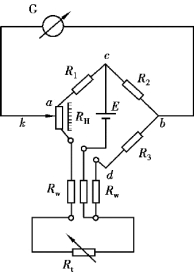 图2.35为平衡电桥基本原理图,图中Rt为热电阻,阻值随温度而变化,R2和R3为固定电阻,R1为可调电阻,由这4个电阻组成桥路的4个桥臂。G为检流计,E为电源。当Rt值改变时,桥路平衡被破坏。检流计G偏转,这时改变R1值,使电桥重新达到平衡,检流计G指零,这时有