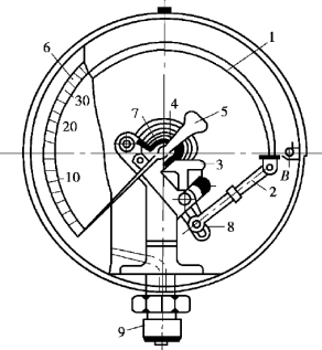 1—弹簧管;2—拉杆;3—扇形齿轮;4—中心齿轮;5—指针;6—面板;7—游丝;8—调整螺钉;9—接头