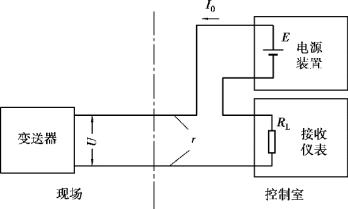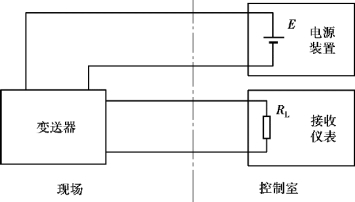 对于二线制变送器,同变送器连接的导线只有两根,这两根导线同时传输供电电源和输出信号,如图3.8所示。可见,电源、变送器和负载电阻是串联的。二线制变送器相当于一个可变电阻,其阻值由被测参数控制。当被测参数改变时,变送器的等效电阻随之变化,因此流过负载的电流也随之变化。