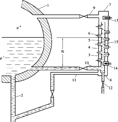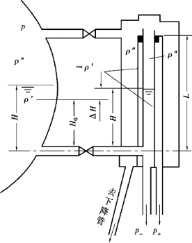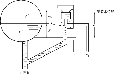 双室平衡容器中正负两根管内水的温度比较接近,可近似认为正负压管中水的密度相同,皆为ρ1,因此有