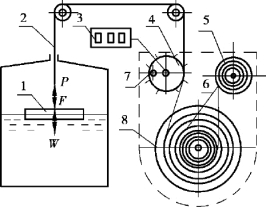 1—浮子;2—钢带;3—计数器;4—链轮;5—平衡弹簧;6—弹簧轮;7—传动销;8—钢带贮轮
