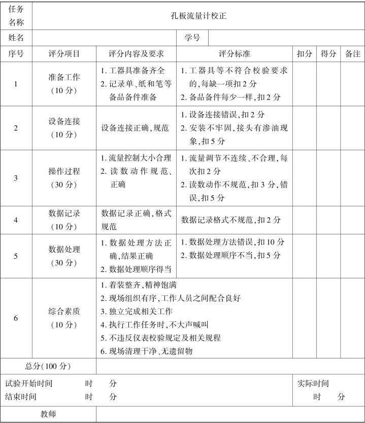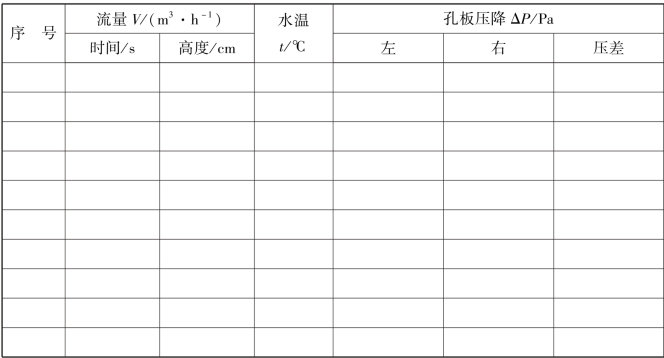 ③对应每一个阀门开度,用容积法测量流量,同时记下压差计的读数,按由小到大的顺序在小流量时测量8~9个点,大流量时测量5~6个点。