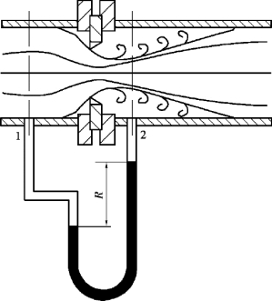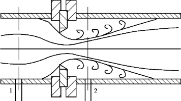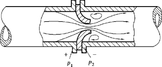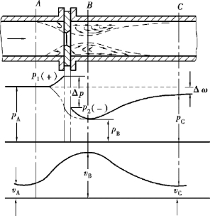 图中的点画线代表管道中心处静压力,实线代表管壁处静压力。分析节流件前后压力的变化情况,在节流件前,流体向中心加速,管壁处静压力增加,管道中心处压力降低;至截面2时,流束截面收缩到最小,管壁和中心处静压力降至最低。然后流束扩张,静压力升高,直到截面3处。由于涡流区的存在,导致流体能量损失,因此在流束充分恢复后,截面3处的静压力p3不能恢复到原先的静压力p1,而产生了压力损失δp=p1-p3。