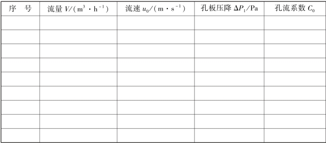 c.读取流量V(由闸阀开度调节)对应的压差计高度差R,根据u0=C0 2Δp/ρ和Δp=ρgR,求C0值。