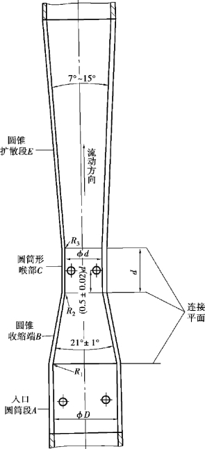 经典文丘里管的轴向截面如图5.4所示。它是由入口圆筒段A、圆锥收缩段B、圆筒形喉部C、圆锥扩散段E组成的。圆筒段A的直径为D,其长度等于D;收缩段B为圆锥形,夹角为21°±1°;喉部C为直径d的圆筒形,其长度等于d;扩散段E为圆锥形,扩散角为7°~15°。