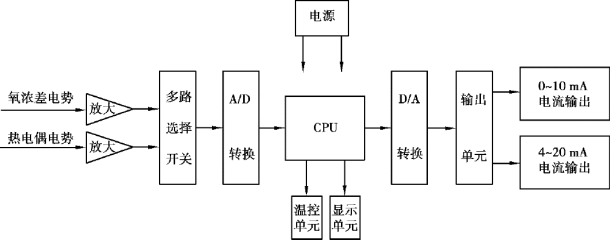 由图6.2可知,探头产生的氧浓差电势信号、热电偶电势信号经分别放大后,由多路选择开关将其输入A/D转换器,经A/D转换后由CPU根据能斯特方程计算出氧量值,再经D/A转换、光电隔离及V/I转换,最后得到DC 0~10 mA或DC 4~20 mA的电流信号输出。