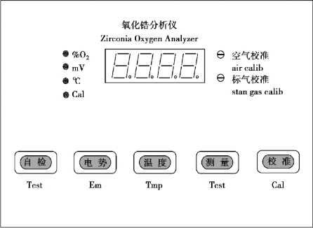 具体操作:将变送器电源开关拨至“开”后,探头加热炉开始升温,“℃”指示灯亮,LED显示探头加热炉温度值(如果安装的是新探头,开机后可能出现“V”指示灯亮、LED显示为“HHHH”并闪烁的现象,这是因为新探头内保温材料含水分过多造成氧电势信号过大而超出量程,一般情况下,开机后1 h左右仪器将正常工作)。当加热炉温度达到600℃时,“%O2”指示灯亮,变送器电路将自动运算并显示测得的氧量值。此后,LED显示内容由操作按钮决定。例如,当按住时,“%O2”指示灯亮,LED显示自检氧量值(自检功能是为诊断变送器运算电路是否正常而设置的,其自检氧量值不代表探头所测氧量值);当按住