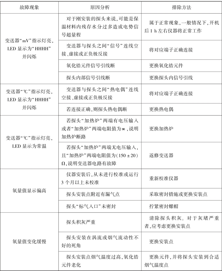 氧化锆氧分析仪产品故障易出现在探头部分,表6.2列举了常见故障现象、原因及排除方法。