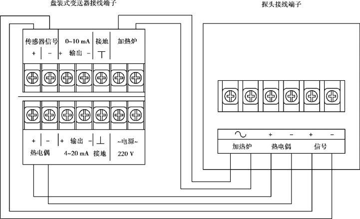 注意:将探头与变送器相应端连接时,不要错接、虚接或正负极反接。请勿将外接电源接入变送器或探头的“信号”“热电偶”或“加热炉”接线端,否则,会损坏仪器。