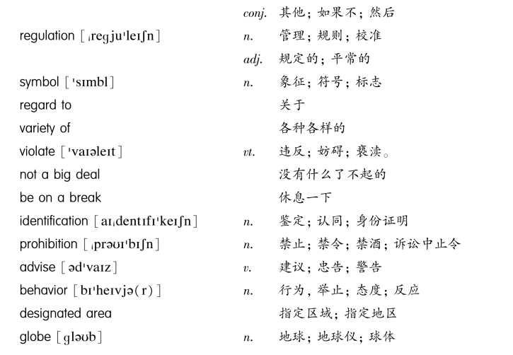 一些标识的颜色是红色的。我们都知道,在公共交通中,红色意味着停止、禁止。所以红色的标识强烈建议一些人的行为在指定区域内是不允许,像“禁止吸烟”“禁止喝饮料”和“禁止携带宠物”。如果人们不遵守指定区域内的标识,他们会让自己惹上麻烦。
