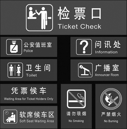 Inside of a station,there are more signs.Some signs are in letters,some of them are in symbols,but most of them are in both letters and symbols.Among these signs,the most we can see are the“EXIT”signs in green,which can tell us the ways to get out of the station.The bathroom signs are not in letters,usually in symbols of a man and a lady together to point out where the WC is.