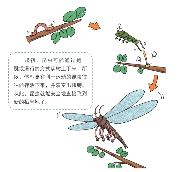 我们已经说过,在泥盆纪时,昆虫沦为两栖动物的口粮。到了石炭纪,为了躲避捕食者、征服新的领地和寻找新的食物来源,昆虫开始冲向天空,成为最先掌握飞行技术的动物。