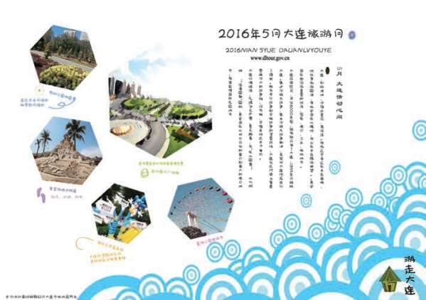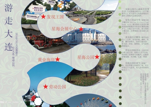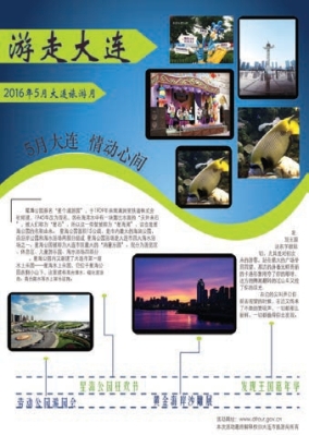 作业说明:徐莉乔同学的大连旅游月宣传广告巧妙地将图片素材组合成曲线形态,将版式做左右分割。文字和图像排列整体布局合理。