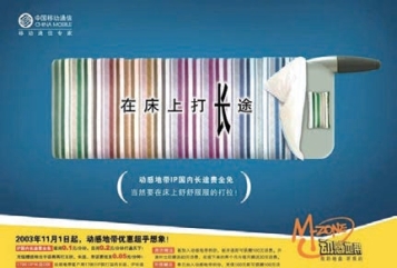 比较典型的广告语有两种类型:一是强调商品优点的广告语,二是促使读者采取行动的广告语。例如图2-30中国移动动感地带的广告语“在床上打长途”就是有一定的刺激性,透露出一种悠闲感,能够促进消费者购买欲望。
