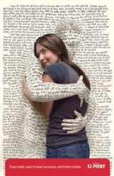以图形为主的广告,字体在视觉效果上就应服从于图形,处于从属的地位。字图要互相穿插重叠,有机地结合成一个整体,从而加强广告画面统一的视觉效果;如果以字体为主的广告,字体处于主导地位,人物或商品形象处于从属地位时,就应该注意字体的排列以及图形位置的安排。例如图2-35邮局广告明显的字图组合运用,文字组合成拥抱的人形,体现广告主题,写一封信给爱的人。