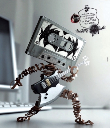 广告插图应具备简洁单纯的视觉效果,广告插图要勇于创新、生动有趣。同时广告插图必须有针对性,因为广告插图的宣传对象是不同的消费者,若想使每个人都接受你的广告,那是徒劳的。只有根据商品内容来选择广告对象,针对广告对象的需要,设计具有针对性的插图,才有成功的可能性。在选用广告插图时必须符合广告主题,才能达到广告的宣传目的。而且广告插图还必须是可信的。例如图2-41中的图案,录音带拟人化设计,传达和音乐有关的主题,非常有趣味感,符合主题,达到广告宣传目的。