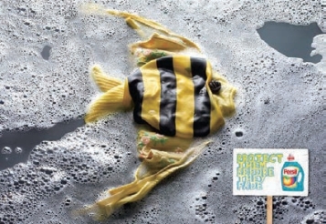 把人们熟悉的事物同广告所要表现的主要思想有机地联系起来,使读者产生联想并领悟其中蕴含的意义。例如图2-51是洗洁精广告,将手套变成鱼的外形,比喻在洗洁精里好像在水中一样的舒适,无任何刺激,体现产品的特点。