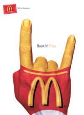 摄影照片、绘画、电脑插图都是广告插图经常用的手段并且各自有其特点。摄影手段表现的插图,具有真实、直观、可信的效果。绘画手段表现的插图,使广告画面更具视觉吸引力和艺术效果。电脑合成的广告插图,使画面更生动。例如图2-42麦当劳手的插图,利用电脑技术合成,画面生动有趣。