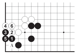 如图5,这是定式以后的棋形,黑1尖是接下来的常规官子下法,白2挡,黑3再扳还是先手,与白棋在A位靠相比,这是黑棋单先8目强的官子。