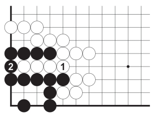 如图2,如果轮到白棋先走,白1粘,黑2也需要粘,这样白棋是先手,与图1黑棋断吃相比,白棋增加2目,黑棋减少6目,这是单先8目的官子。