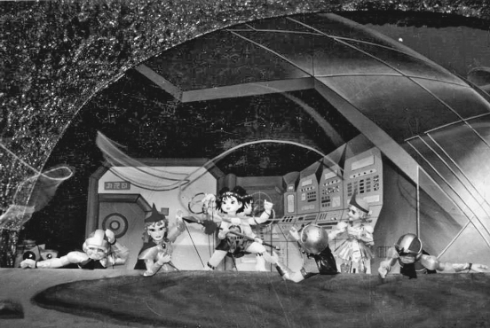 孙锦年:《闪光的珍珠》主要是反映上海某个电厂的工人们是如何辛苦工作的,是现代题材的戏。但是我们用了好多传统的手法,使它像神话一样。电厂落成通电了,我们使用特技手法,幕布后用几排并列的镭射条形灯顺着一个方向不停地闪跳过去,舞台一下子明亮了,千家万户都有灯,包括神仙、仙女都下凡了。台上的灯光搞得非常丰富、非常热闹,我们还邀请朱逢博老师来伴唱,效果挺好的,大家都喜欢。现代题材的木偶戏比较难搞,不加一些手段和特技,没有名人的支持,可能上座率会受影响。