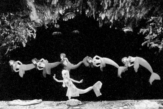 孙锦年:《美人鱼》是20世纪80年代初期排演的民间故事神话剧。舞美灯光手法新颖丰富,海底世界和龙宫很美。运用老式的高压汞灯,灯前装上紫色玻璃罩,用变压器触发灯慢慢亮起来,灯管温度高了会自动熄灭,要等冷却才能再次使用。《美人鱼》首次创造了海底世界美丽意境,把能表现的特技手法都用上了。在演出中把重复使用的特技逐步修改、调整。那些水灯、水景都是紫外线灯配合下产生美好舞台效果的。天幕背景特技很丰富,鱼儿游来游去、水草在水波中摇曳、串串水泡从海底升起,几台不同形式的水灯在不同场景中运用,产生不同效果。演员感觉是在水里面演戏。