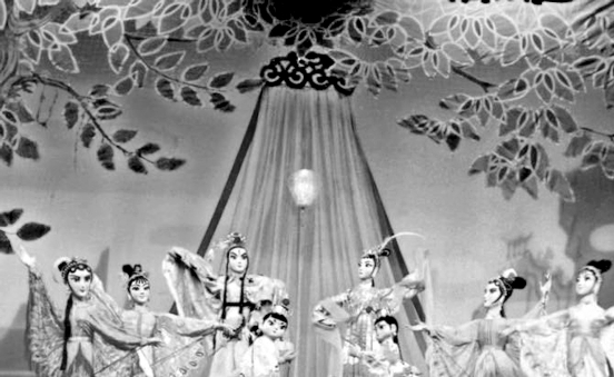 孙锦年:第一场大幕徐徐拉开,舞台上烟雾茫茫,天幕是崇山峻岭。远景中悟空站立云头探路过场,唐僧骑在白龙马上,师徒三人从两座山顶上的独木桥缓缓而来。我们利用灯光特技手段,幻灯胶片画上人物,采用电动马达的单轨效果器转动。人物通过幻灯投影,把活动的人物展现在天幕布景上,活动的人物在静止的景中过场,惊险逼真好看。
