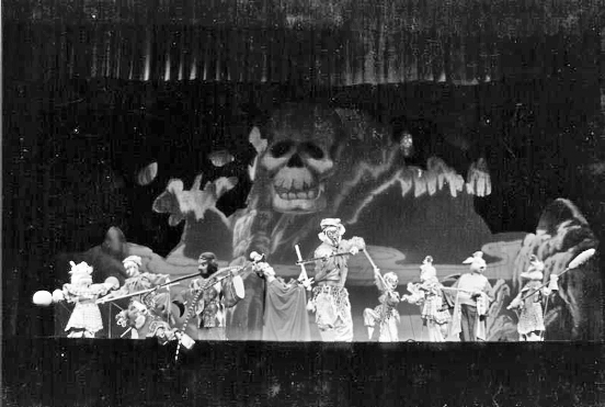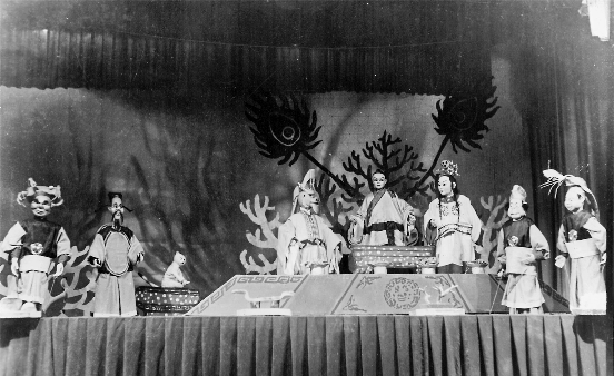 赵根楼:当时的各种设备还停留在20世纪60年代初的水平,设备很一般,比较落后。我们演出是现场配音的,没有录音,很多都是自己操作自己配音。当然有些主要角色也是需要多人操作的。比如说演一个女主角,但是操作木偶的是男演员,那么势必要一个女演员来配音,这就是专职配音。不能同时承担木偶的配音和操纵这两个任务的情况下,只能由两个人来完成这一个角色。我们现场一般都是用那种老式话筒,台上装一个、旁边装一个,台下一般左中右三个话筒,用来现场配音。而音乐有用录音机录磁带的,另外有我们剧团小乐队。差不多到了20世纪70年代以后,上海木偶剧团乐队就慢慢发展起来了。在此之前我们的乐队挺简陋,因为“老八哥”以前是唱京剧的,二胡、扬琴、琵琶、唢呐等就组成了小乐队。灯光、舞台效果则完全谈不上,传统戏不讲究这些东西。后来引进了新文艺工作者,专业的儿童剧导演、话剧导演等都介入木偶戏创作以后,想象力,以及对专业的要求,就发生了很大的变化。上海木偶剧团1960年成立前后大致就是这么个情况。