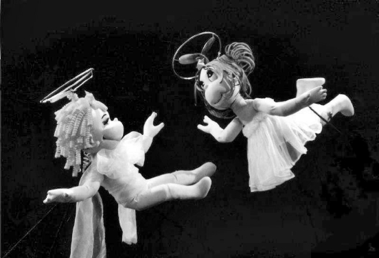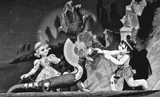 钟晓婷:飞船飞上去,然后下面冒火花,配合表演,给观众的视觉冲击是很不得了的,这都是舞美等各方面配合的效果。还有空中大战,有许多飞来飞去的画面,其实都是涂了荧光粉的球扔来扔去,但给人的感觉是非常眼花缭乱的。我唯一参加演出的就是这次,因为这部剧的最后有一个哪吒莲花化雨的场面。花瓣要开,雨要下下来,但没那么多的演员来托着花瓣。我们到北京去参加比赛,人数是限定的,所以我就去参加了这场莲花花瓣的表演,去帮着托一下。这是我唯一一次上木偶舞台的经历。