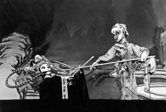 翟羽:《春的畅想》是建国50周年的献礼剧目。当时我们剧团经常到外国去演出,看到欧洲的一些国家的许多小节目,不是剧目,是节目。他们穿着黑衣服,在黑的背景前操作木偶。他们穿黑衣服的目的,不是为了把演员和木偶区分开,而是要减弱人对木偶的干扰。观众一直看着操纵演员那么大一个人在那里晃来晃去,对他的干扰很大,而穿了黑衣服,相对来说,观众注意力会集中在木偶的身上。当时在场的几位领导就觉得,既然如此,如果我们把演员隐掉,不是看得更清楚吗?
