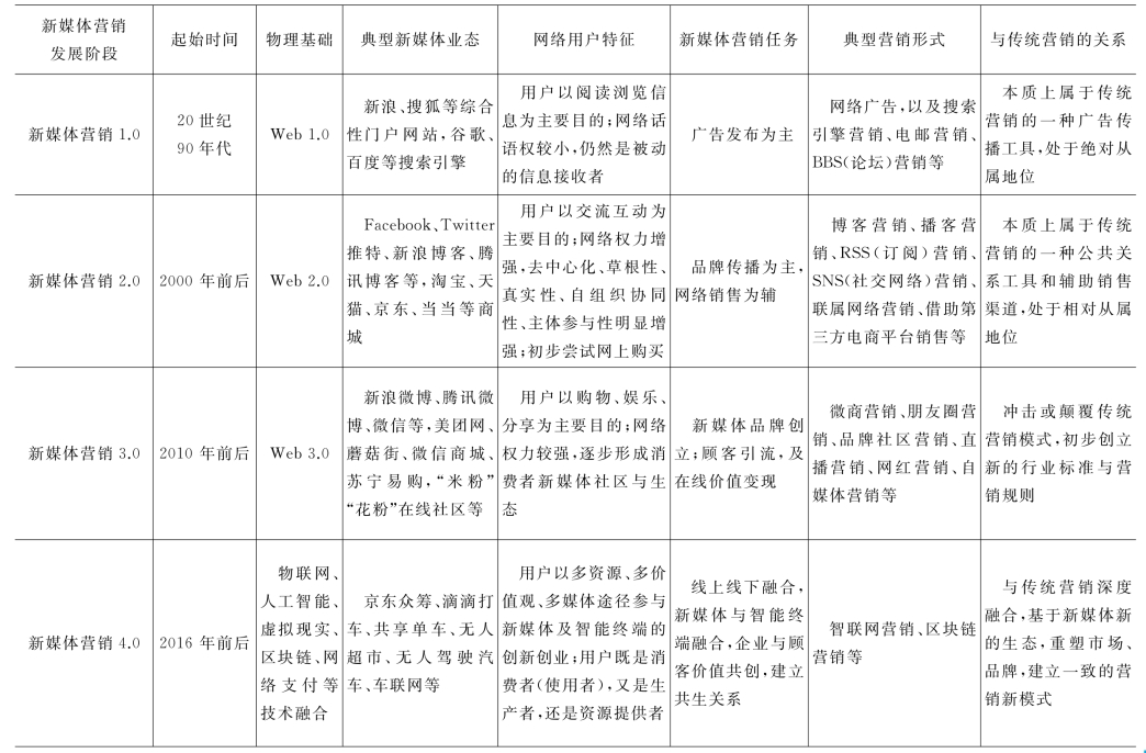 根据新媒体技术特征、该阶段新媒体营销特征及与传统营销的关系模式,本书将新媒体营销的发展分为四个阶段,见表1-1。
