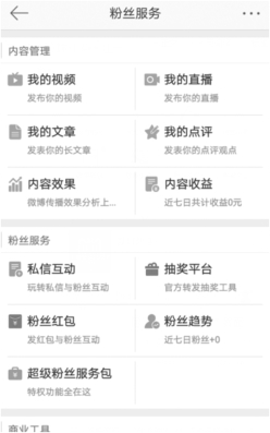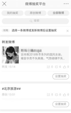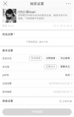 打开手机版新浪微博,点击“我”打开界面,如图6-11所示;然后再点击“粉丝服务”选项打开“粉丝服务”界面,如图6-12所示;接着点击“抽奖平台”选项,进入“开始抽奖”页面,如图6-13所示;最后选择一条发布的微博,点击“抽奖”,进入抽奖设置页面,如图6-14所示。