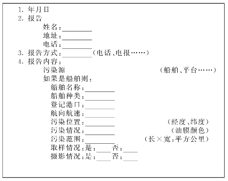 当监视发现海面有溢油时,应该把有关情况详细记录下来(表4.9),并报送有关部门(国外一般称“抗溢油中心”)。