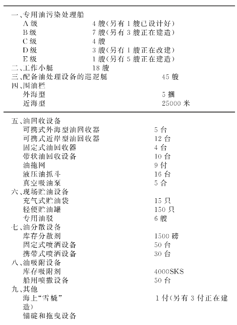 日本民间抗溢油中心“海上灾害防治中心”,到1980年3月底库存的防油污材料有:围油栏100万米,吸油材料740吨,油处理剂2700公斤,油回收船114艘。