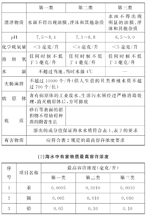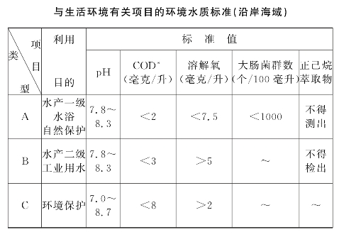 注:第一类适用于保护海洋生物资源和人类的安全利用(包括盐场、食品加工、海水淡化、渔业和海水养殖等用水),以及海区自然保护区。