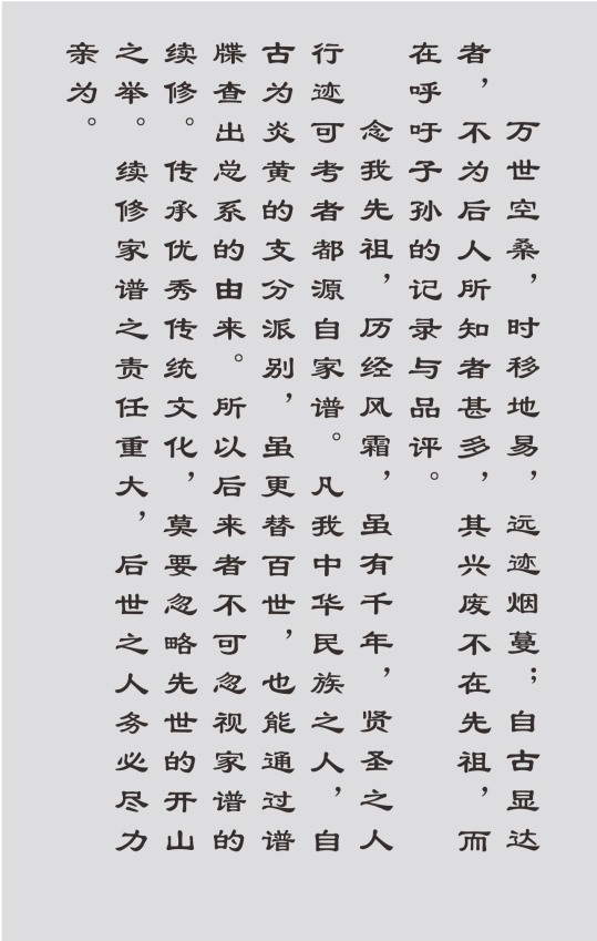 古人续修家谱,志在别长幼、续亲情。上昭高祖遗训,下联子孙之绪,弘扬先祖泛爱亲人之美德,歌颂圣贤之大义。