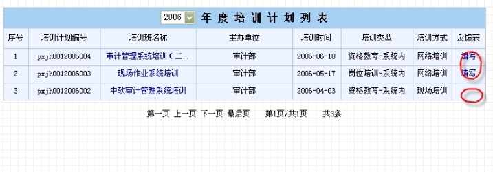 填写了培训反馈后,“反馈表”一栏中将不会出现“填写”的操作链接;在“审计培训情况”功能中添加培训反馈中的培训计划,列表中将不再将其列出来,见“审计培训情况”。