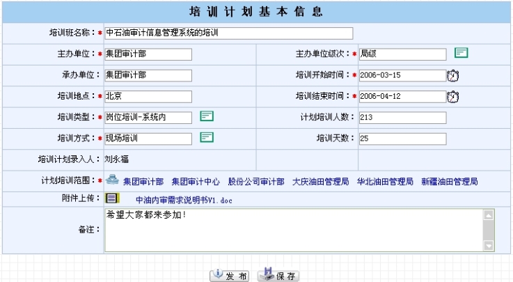 点击“保存”按钮,将计划存为草稿,只有自己能看到,以后还可以修改后发布;点击“发布”按钮,即将培训计划发布出去,在培训范围之内的人将可以看到此计划,如图3.2-8所示。