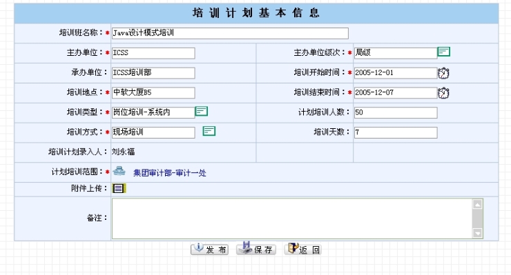 此页面和添加培训计划页面十分相似,只是将已有的计划信息填入了各个域,修改完毕后点击“保存”按钮,则将其保存为“草稿”状态,点击“发布”按钮,则将其存为“发布”状态。