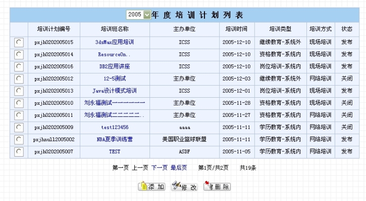 查询培训计划是将当前登录人所做的培训计划都列出来,可以添加新计划,也可以修改、删除已有的计划。