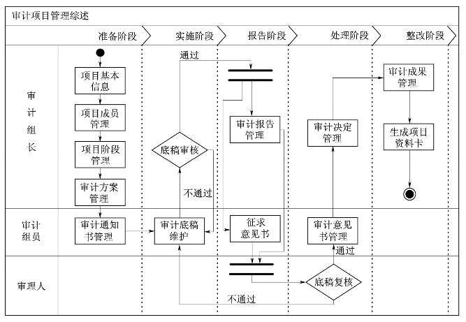 整个的项目过程分为准备阶段、实施阶段、报告阶段、处理阶段、整改阶段。项目组成员在各个阶段按照各自职责完成指定的功能。
