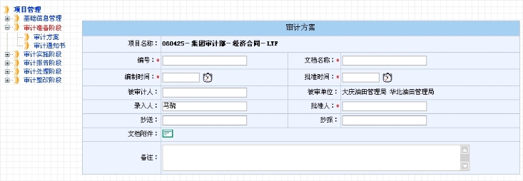 点击左面的项目管理树型列表,选择各个审计阶段任务,在右面的详细信息页面填写对应的公文信息,将经过审批后(公文系统流转后)的公文的原文件(电子文档)附加到系统里作为公文附件,如图4.1-17所示。