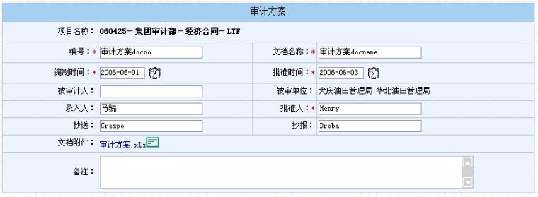 在审计准备阶段需要审计人员填写审计项目的审计方案和审计通知书的详细信息,同时可以上传相应的公文附件。其中审计方案和审计通知书的信息是必须提供的。项目组长和项目主审可以对公文信息进行修改,其他成员只能浏览,如图4.1-16所示。