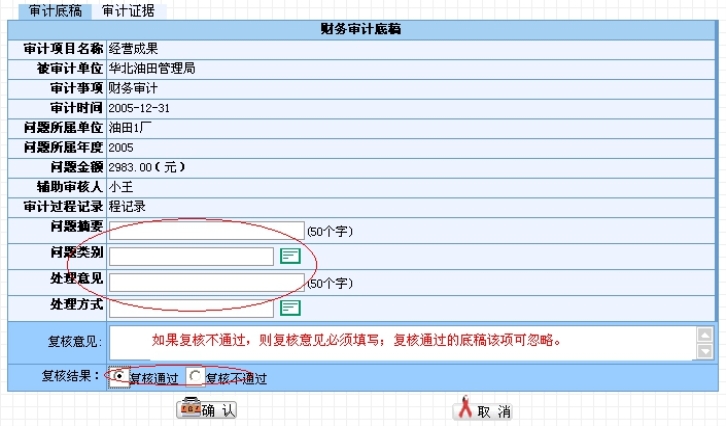 如果审计底稿复核人认为该底稿复核通过,需要填写问题摘要、处理意见,选择问题类别、处理方式,复核意见可以不填;如果复核不通过,则复核意见必须填写,以便底稿提交人在修改底稿信息时有所参照。