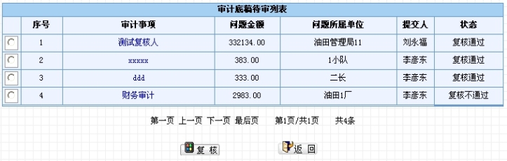 提交复核或审理的底稿如果被组长、主审、审理人驳回,则在底稿列表中相应的底稿状态为“复核不通过”、“审理不通过”,如图4.1-43所示。底稿提交人可以通过修改底稿后,再次提交复核、审理,同时系统会提示驳回的原因,如图4.1-44所示。