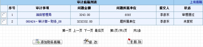 选择要上传的数据文件。该数据文件为xml格式的文件,可以通过现场审计软件的导出工具生成。如果在上传的过程中提示数据格式不对,请联系数据管理员。上传完毕后,会在底稿列表中新增数据文件中包含的底稿信息。所有通过该方式添加的底稿的状态默认为“草稿”状态,底稿作者为当前提交人。用户可以通过修改底稿来做相应的调整。其他操作相同。