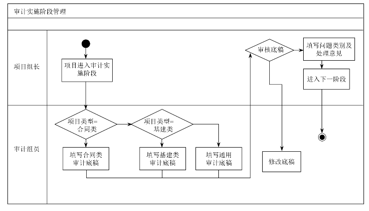 首先由审计组长将项目状态置为审计实施进行中,然后由项目组成员根据项目类别填写财务类项目、基建类项目或合同类审计底稿。按照审计组长的工作分配,每个审计人员分别编辑、维护自己的工作日记、审计底稿,并且将审计证据(即记账凭证)的原稿电子档作为附件上传到系统中;将底稿提交审计组长或主审复核。审计组长或主审在复核的过程填写底稿中对应问题类别、处理方式等意见,如果复核不通过,则将底稿返回到填写人做进一步修改。操作流程如图4.1-24所示。